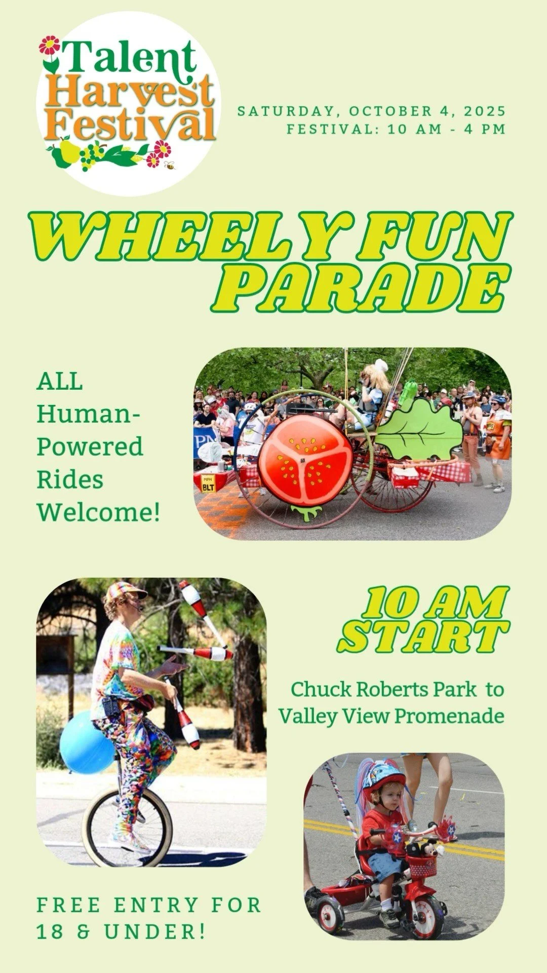 Have your costume and decorations for your ride ready early? Share them on Instagram (@talentharvestfestival) or Facebook (Talent Harvest Festival) and be sure to tag the Talent Harvest Festival! Let’s get some friendly creative competition rolling early!